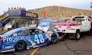 Johnson’s battle-worn car comes in on a wrecker at Phoenix International Raceway. Photo credit: Getty Images NASCAR Sprint Cup racer Jimmie Johnson...