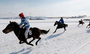 REUTERS/Ilya NaymushinRiders compete on the frozen Yenisei River during the 45th Ice Derby amateur horse race near the settlement of Novosyolovo, south...
