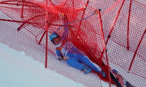 Reuters/Mike SegarItaly’s Elena Fanchini gets tangled in the safety net after crashing in the first training session for the women’s alpine skiing...