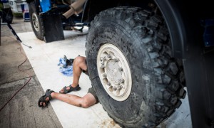 Work shoes, Dakar style. A mechanic from Team Kamaz Master works on the truck during the Dakar Rally rest day in Salta,...