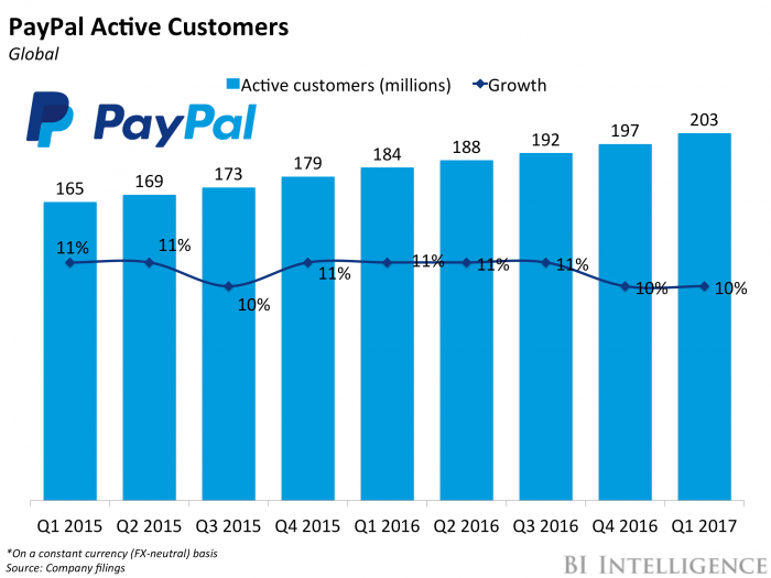 - PayPal added customers while growing its volume. PayPal added 6 million new customers in Q1, bringing its total to 203 million active users. That’s up from the 4.5 million that it added in the same quarter last year, and puts it on track to add 20 million or more in 2017. The firm also managed to hit $99 billion in total payment volume (TPV), relatively flat sequentially but up from $81 billion last year, marking 25% growth.