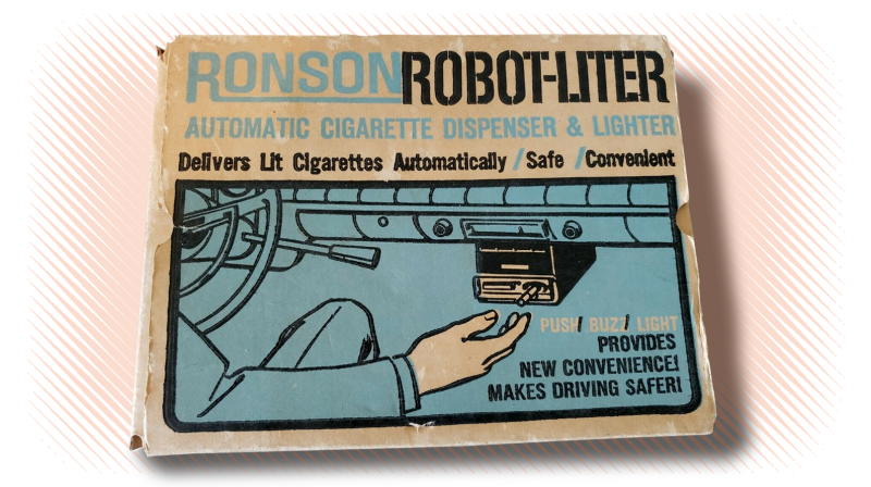 The Ronson Robot-Liter was the perfect accessory for smoker-drivers who were fed up, just absolutely sick of the tedious, inefficient joke of a process required for someone to enjoy a comfortable smoke in the car.