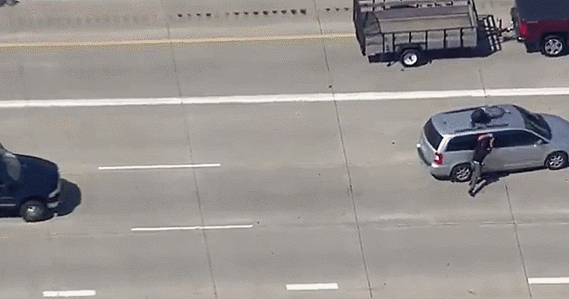 The video shows the end of the chase, where the suspect fled on foot in the middle of a highway after his (what looks to be) Nissan Rogue got a flat tire. He ran into oncoming traffic and flew into the hood of the oncoming minivan, and then climbed onto its roof. The panicked van crept along the highway as police surrounded it, with one cop not hesitating to leap onto the roof and tackle the suspect down to the ground.
