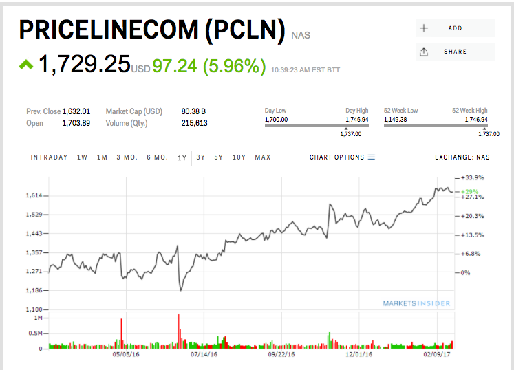 Priceline reported fourth-quarter revenue that beat Wall Street estimates, and the stock is climbing. Priceline is up 5.96% at $1,729.25 a share on Tuesday morning.