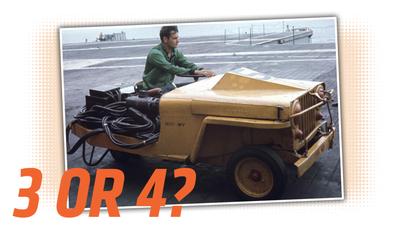 The Willys NC-1a was a very specialized Jeep variant; it’s basically half a Jeep, with a rebuilt rear half, and designed to start jet engines or carry auxiliary power units (APUs) for aircraft. Since it may be used on aircraft carriers, it needs to be small and nimble. That’s why it has rear-wheel steering and can turn in its own length.