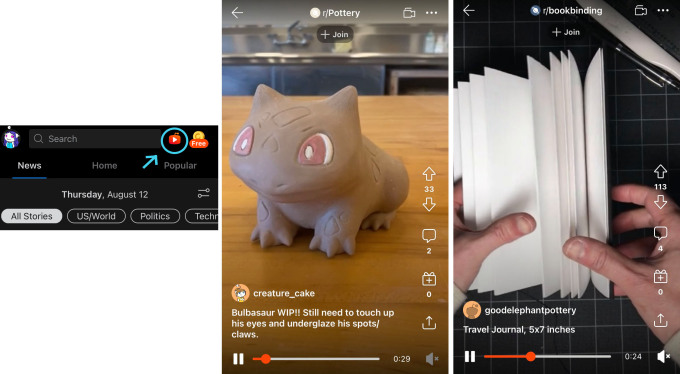 According to Reddit, most iOS users should have a button on their app directly to the right of the search bar — when tapped, it will show a stream of videos in a TikTok-like configuration. When presented with a video, (which shows the poster who uploaded it and the subreddit it’s from), users can upvote or downvote, comment, gift an award or share it. Like TikTok, users can swipe up to see another video, feeding content from subreddits the user is subscribed to, as well as related ones. For instance, if you’re subscribed to r/printmaking, you might see content from r/pottery or r/bookbinding.