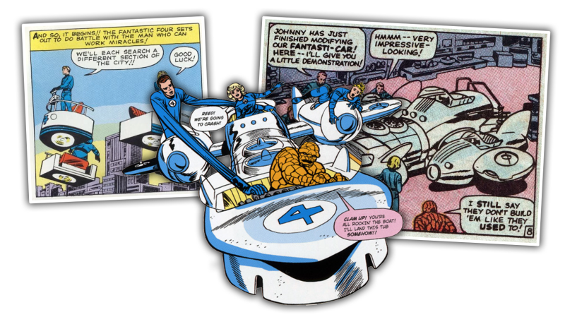 The superhero car in question is the Fantasticar, the aircraft like thing that was nevertheless called a car by the people who used it, the Fantastic Four. I should mention that whenever we talk about the Fantastic Four I should be clear that not all the credit should go to Stan Lee.
