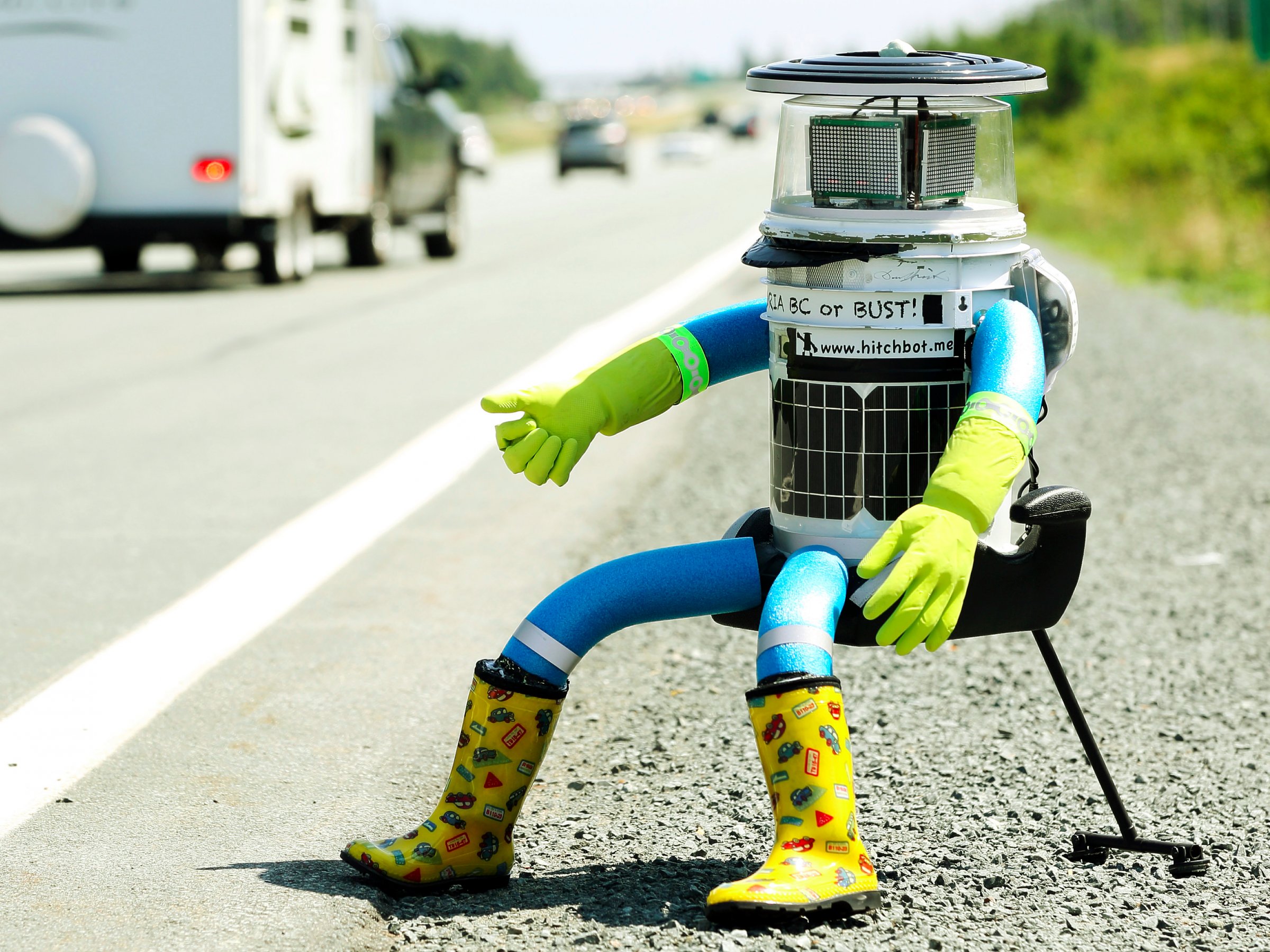 The anthropomorphic robot named hitchBOT sits on the shoulder of Highway 102 to begin its 6,000-kilometer cross-country journey, outside Halifax, Nova Scotia, July 27, 2014.REUTERS/Paul Darrow