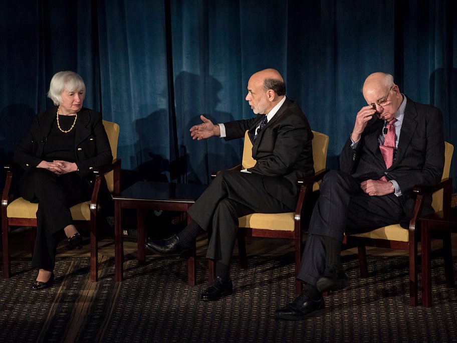 Former Federal Reserve Chair Ben Bernanke speaks during a conversation with Federal Reserve Chair Janet Yellen Bernanke and former Chair Paul A. Volcker April 7, 2016 in at the International House in New York City.Andrew Renneisen/Getty