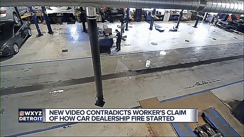 Security footage of a fire that broke out in the service department of a Chevrolet dealership in Sterling Heights, Michigan last week reveals just how lucky the guy buffing the floors is to be alive.
