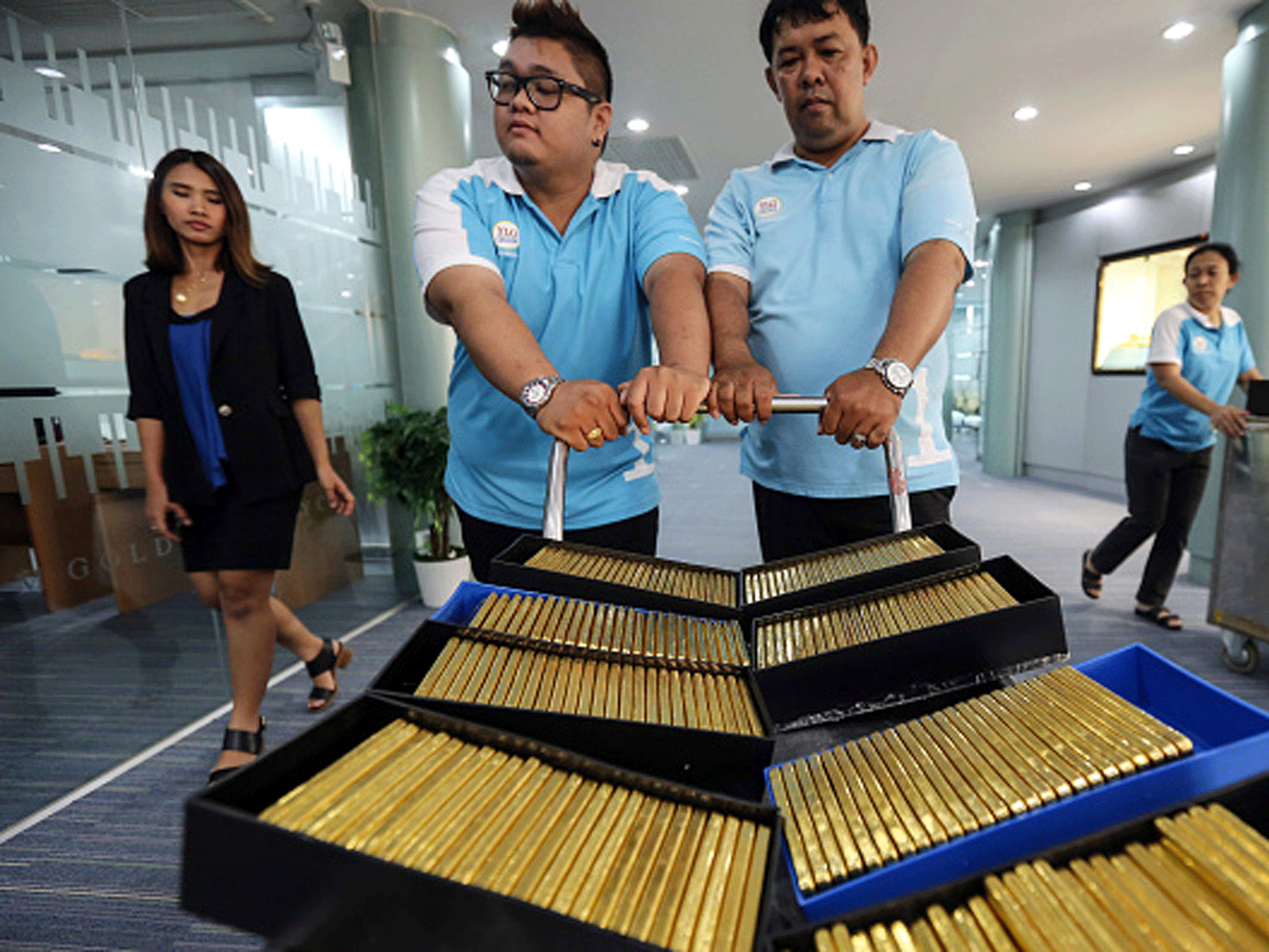 Employees push a trolley laden with crates of one kilogram gold bars at the YLG Bullion International Co. headquarters in Bangkok, Thailand.Getty Images/Dario Pignatelli/Bloomberg