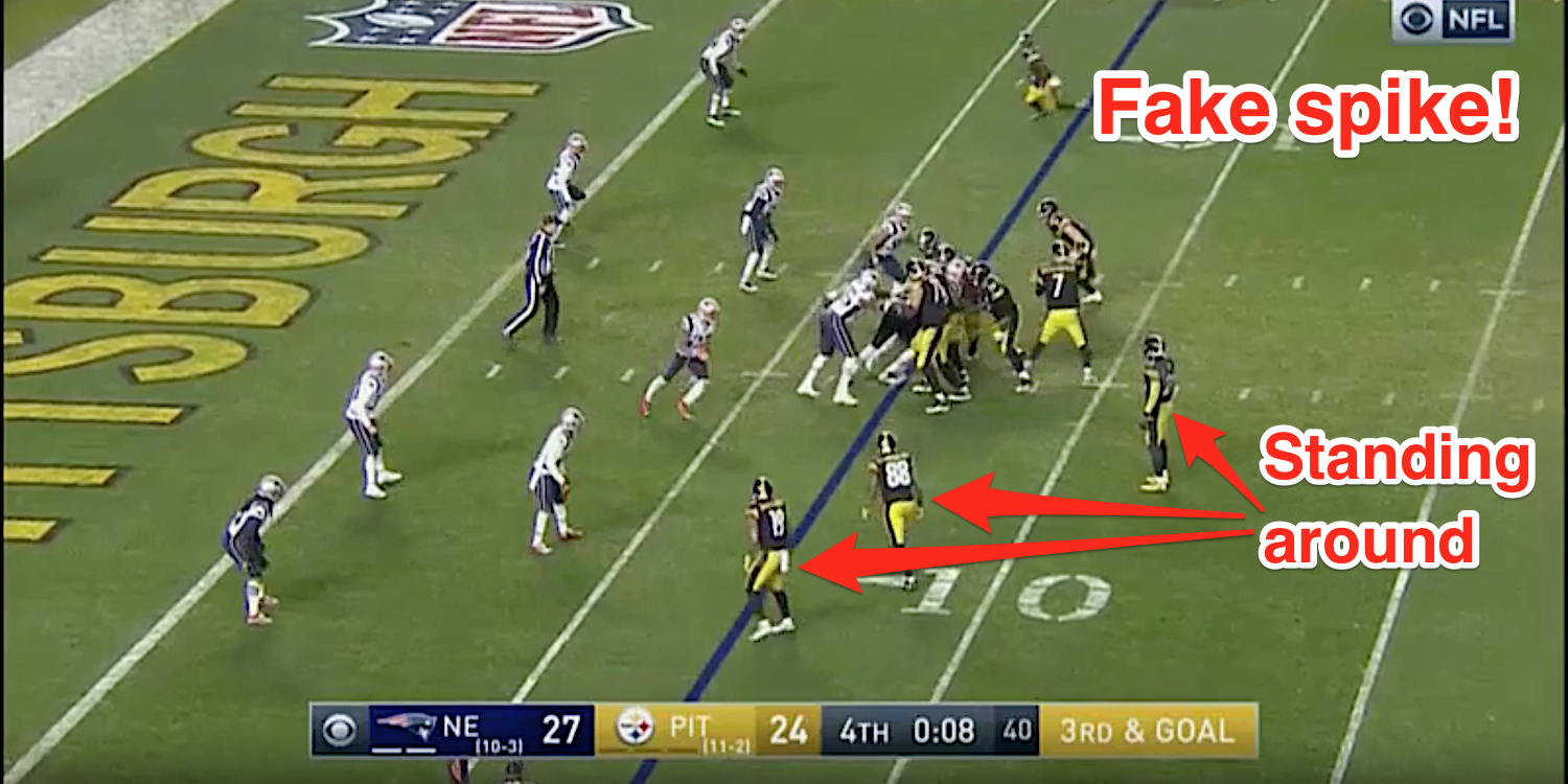 Most expected the Steelers to spike the ball, then kick the easy field goal to tie the game. Instead, with five seconds remaining, Roethlisberger tried to fool the Patriots with a fake spike while he threw it to Smith-Schuster in the end zone.