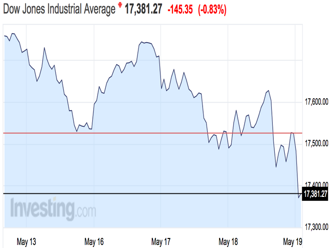Near 10:55 a.m. ET, the Dow was down 171 points (0.97%), the S&P 500 was down 17 points (0.84%) and the Nasdaq was down 43 points (0.92%).