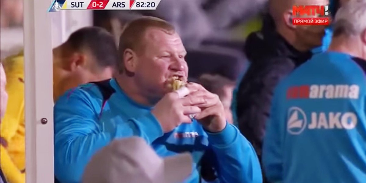 On Monday, with ten minutes remaining during Sutton’s FA Cup match against Arsenal, Shaw was seen eating a pie on the sidelines.
