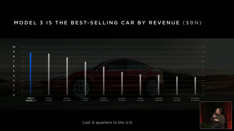 After bringing up how the Tesla Model 3 continues to outsell premium compact sedan competitors like the BMW 3 Series, Audi A4 and Mercedes-Benz C-Class, Elon Musk moved on to say that the Model 3 was the best-selling car by revenue against every high volume sedan sold in the U.S.
