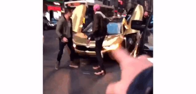 There’s a video making the rounds on Twitter today of two clowns partaking in a “photoshoot” on a busy Manhattan street with a BMW i8, blocking it all up to hell, when all of a sudden a “real old-school New Yorker” comes up and smashes their windshield with a bat. Don’t believe it. It’s fake as hell.
