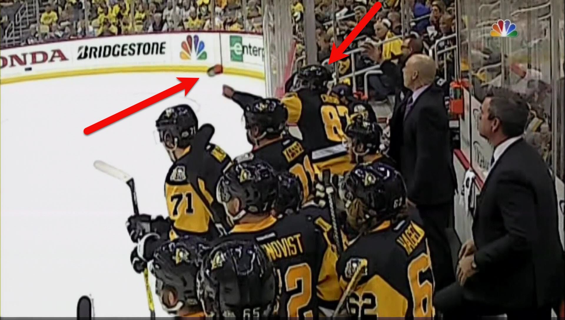 Sidney Crosby threw a water bottle on the ice. Just prior to Phil Kessel scoring mid-way through the second period to make it 5-0, Crosby was on the bench and got angry when a slashing penalty was not called on the Predators. As the bench stood and yelled at the referee, Crosby threw a water bottle onto the ice. No unsportsmanlike penalty was called and Kessel’s goal stood. Crosby later told the ref he didn’t mean to throw the bottle.