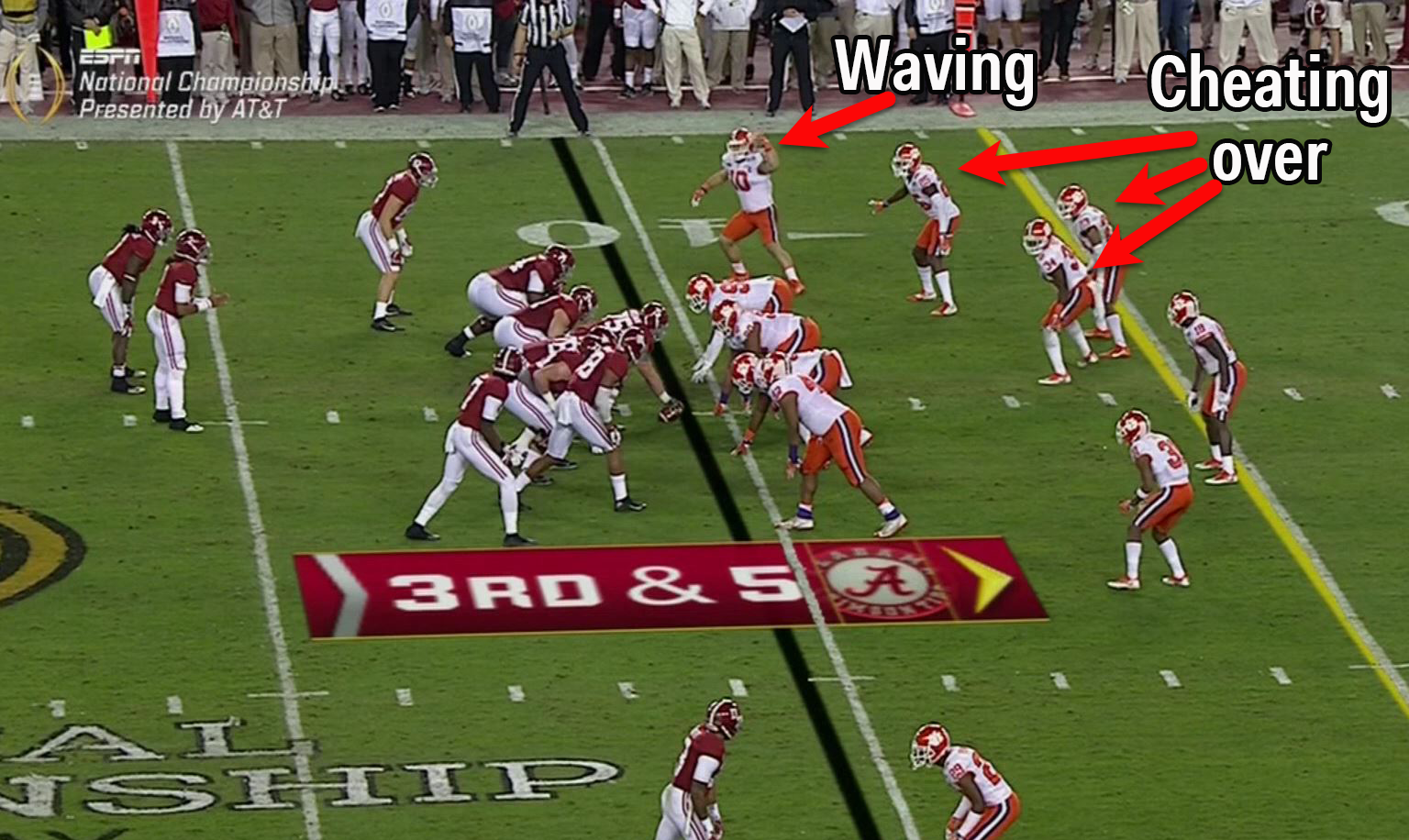 Ben Boulware did his homework. Boulware was named the defensive player of the game for his six tackles, two tackles for loss, and one pass defensed. But his best play is one that didn’t show up in the box score. On a third-down play in the second quarter, Boulware clearly saw something that he recognized from watching tape of Alabama. Before Alabama snapped the ball, Boulware began frantically waving for his teammates to come to his side, signaling that the play was going that way. You can see his teammates start to cheat over. Sure enough, Alabama ran the ball toward Boulware, and Jalen Hurts was stopped for a 4-yard loss.