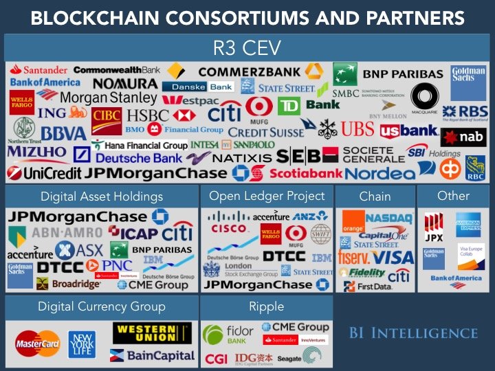 - Banks and major financial institutions are working both collaboratively and independently to develop blockchain tech. Over 50 major financial institutions are involved with collaborative blockchain startups, like R3 CEV or Chain. And many are investing in the technology on their own as well.