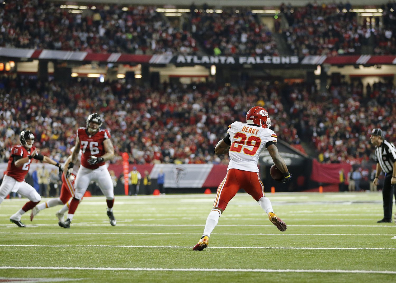 Along with his pick-2, Berry also intercepted Matt Ryan in the first half and took it to the house. He was responsible for eight Kansas City points, and is the first player this season to have two pick-6 plays.