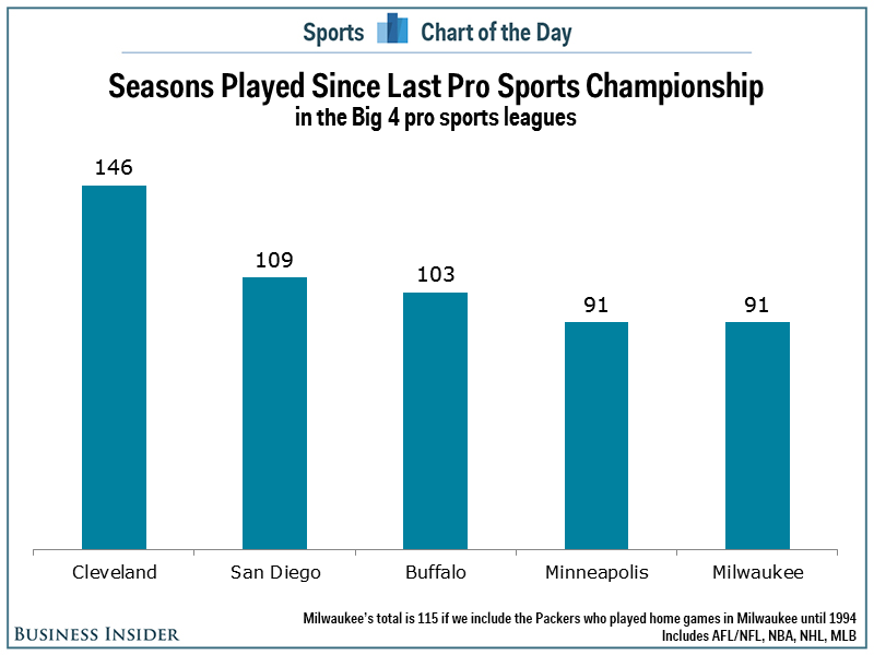 Of the cities in North America with at least one team in one of the four major sports, no city has seen more seasons played across the four major sports since their last championship than Cleveland. If the Cavs lose the Finals, it will be the 147th straight pro sports season without a title. No other city is even close.