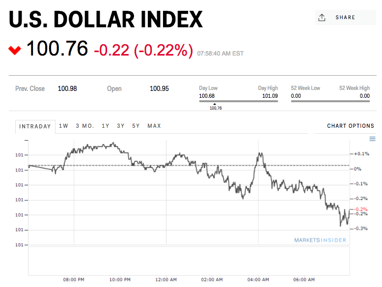 The US dollar index is down by 0.3% at 100.77 as of 8:08 a.m. ET.