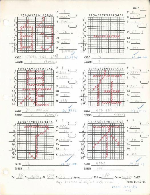 Internal GARF document showing Sinotype III character database and metadata. Courtesy of Louis Rosenblum Papers, Stanford University Special Collections.