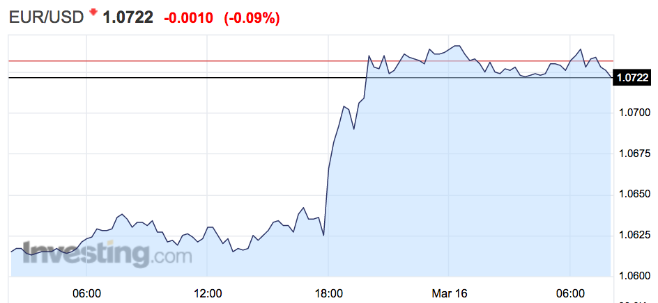 Around 8.15 a.m. GMT (4.15 a.m. ET) the euro is trading at 1.0722 against the dollar, a fall of 0.09% from the start of trading on Thursday, but around 0.9% up from where it was before the Fed’s announcement.
