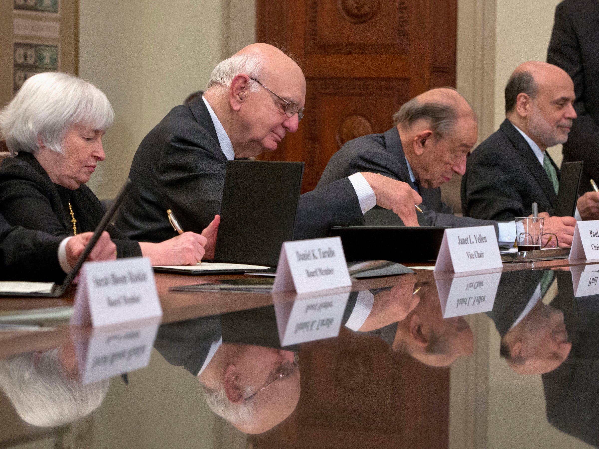 From left, Fed Chair Janet Yellen, former Chairmen Paul Volcker, Alan Greenspan, and Ben Bernanke.AP
