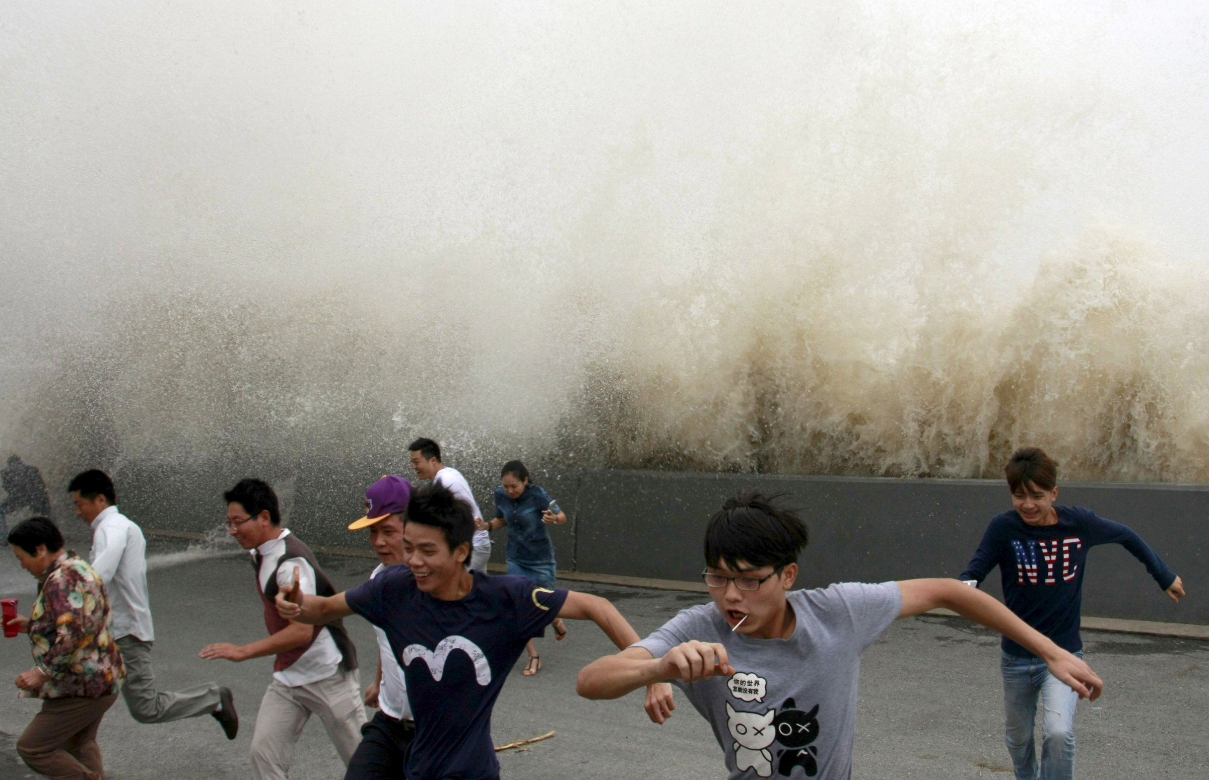 wave running awayVisitors run away from a wave caused by a tidal bore which surged past a barrier on the banks of Qiantang River, in Hangzhou, Zhejiang province, China, September 15, 2015.Reuters