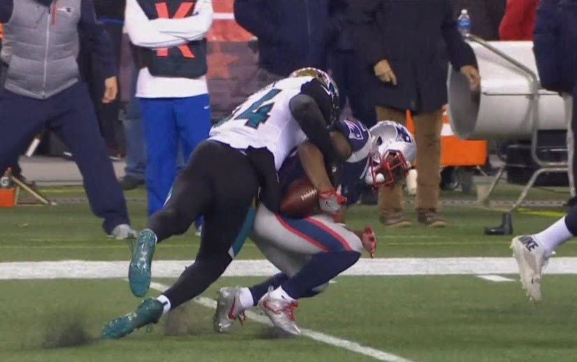 The play came early in the fourth quarter just after the Jags had kicked a field goal to take a 20-10 lead. The Patriots attempted a trick play and a double-pass led to running back Dion Lewis racing down the sideline for a big gain. However, he was caught from behind by Jack who stripped the ball, recovered the ball, and then jumped up and appeared to be heading towards a game-clinching touchdown.