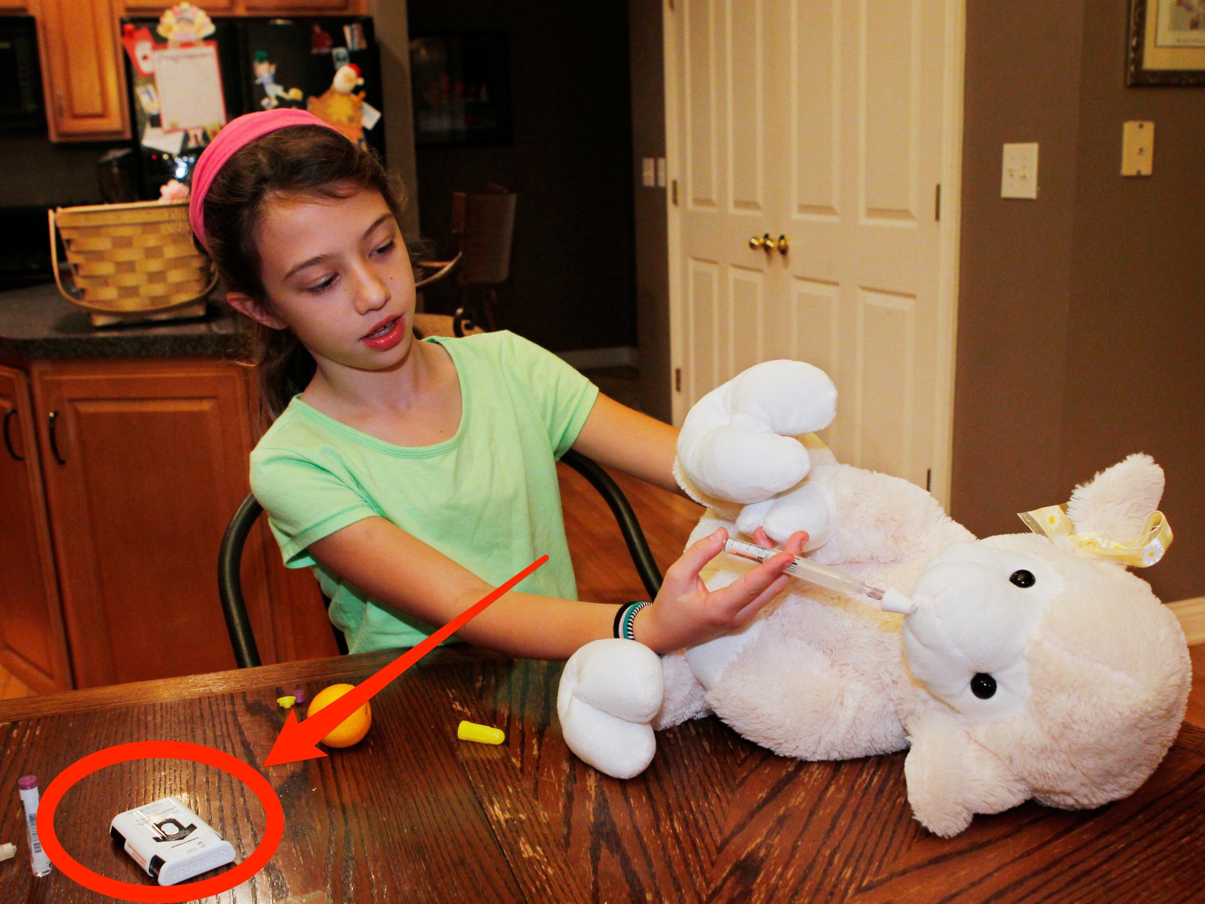 A girl practices injecting naloxone into her stuffed lamb, with a practice Evzio device nearby.AP