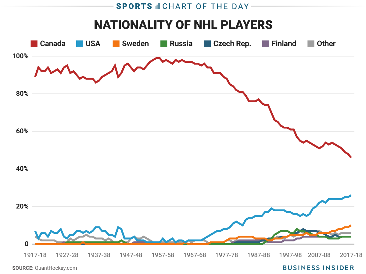 The percentage of NHL players who are from Canada has fallen to 46.1%,according to data collected by QuantHockey.com. Meanwhile, the percentage of US-born players in the NHL is up to 25.7%, its highest level ever.