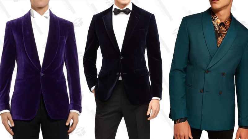 Double-breasted and velvet? Come on! This bright green jacket from ASOS Design will definitely draw attention, so make it worth partygoers’ while. Since the lapels button up rather high for a double-breasted suit, we say skip the tie and go for an unusual and colorful bowtie instead.
