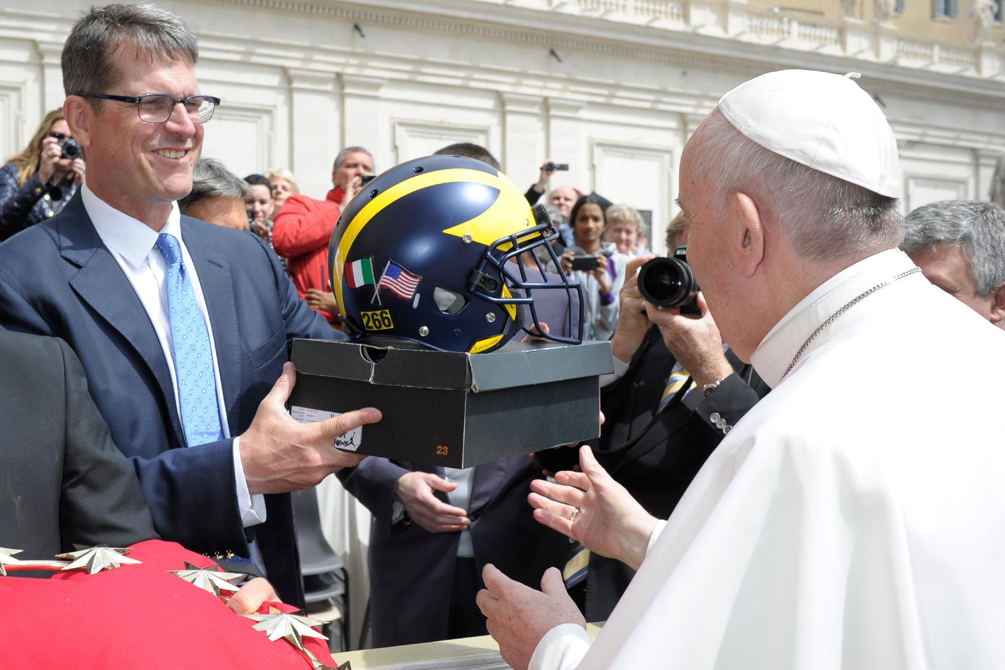 After the address, Harbaugh took the op[portunity to present the pope with some gifts, a Michigan football helmet and some Air Jordans, leading to this amazing photo from L’Osservatore Romano for the Associated Press.