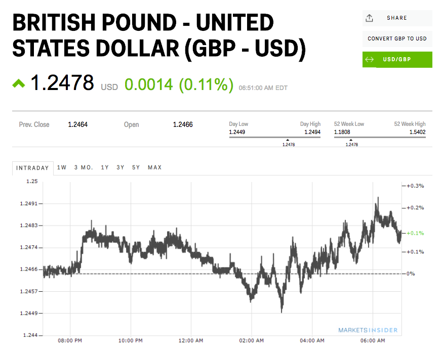 At the close of the European trading day sterling was around 1.2% higher, and it has continued to gain on Friday, albeit not by much. Just after 11.55 a.m. GMT (7.55 a.m. ET) the pound is up around 0.1% against the dollar and 0.2% on the euro. Here’s how both pairings look: