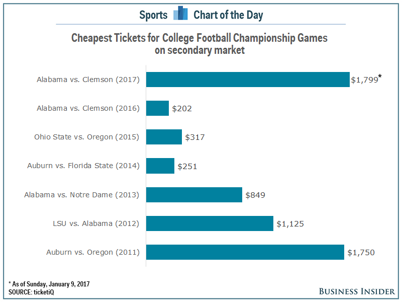 When Clemson and Alabama played for the college football championship a year ago in Glendale, Arizona, fans could purchase tickets on the secondary market for as low as $202, according to data provided by ticketiQ. With the two teams set to face off in a rematch on Monday in Tampa, Florida, the cheapest tickets are now at $1,799.