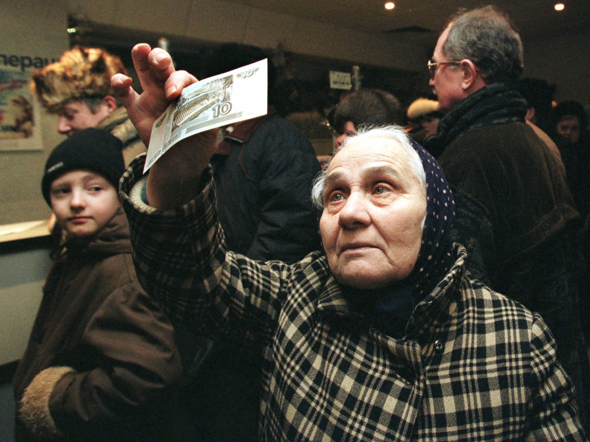 An elderly Russian woman looks at the new 10-ruble bank note at the State savings bank January 5, 1994.REUTERS