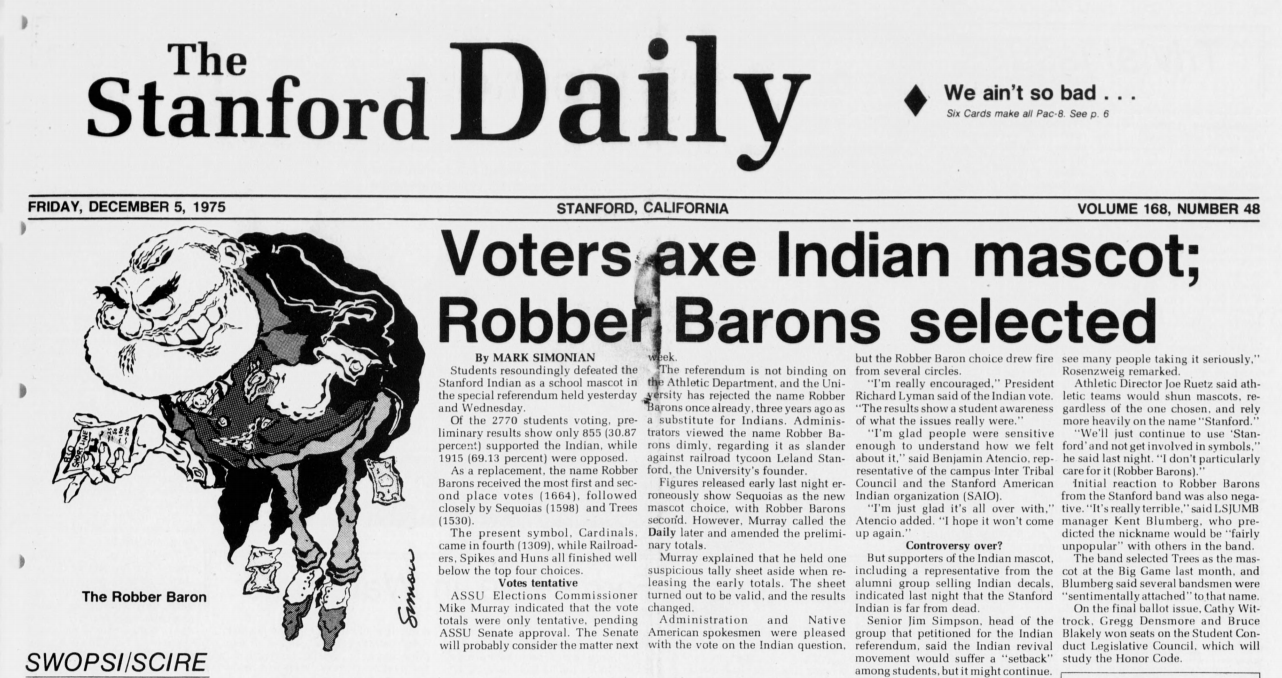 But now Stanford needed a new mascot. In a special student referendum in 1975, “Robber Barons” secured the most first and second place votes (1,664), beating out Sequoias (1,598), Trees (1,530), and Cardinals (1309). Railroaders, Spikes, and Huns all finished “well below the top four choices,”according to a Stanford Dailyarticle at the time.