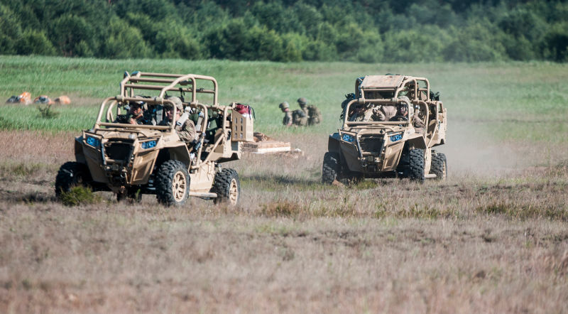The next level down is where the new Infantry Squad Vehicle comes in. After 9/11, U.S. special operations forces pioneered the use of all-terrain recreational vehicles in Afghanistan. ATVs offered rapid movement across cross-country terrain but, being civilian vehicles, offered no protection from hostile fire. The Army expanded their use by purchasing Polaris Defense MRZR all-terrain vehicles, each of which could carry four soldiers and mounted a heavy machine gun, for trials with the 82nd Airborne Division.