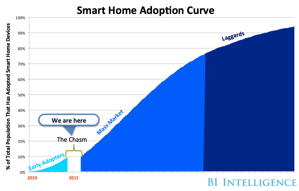 - Currently, the US smart home market as a whole is in the “chasm” of the tech adoption curve. The chasm is the crucial stage between the early-adopter phase and the mass-market phase, in which manufacturers need to prove a need for their devices.