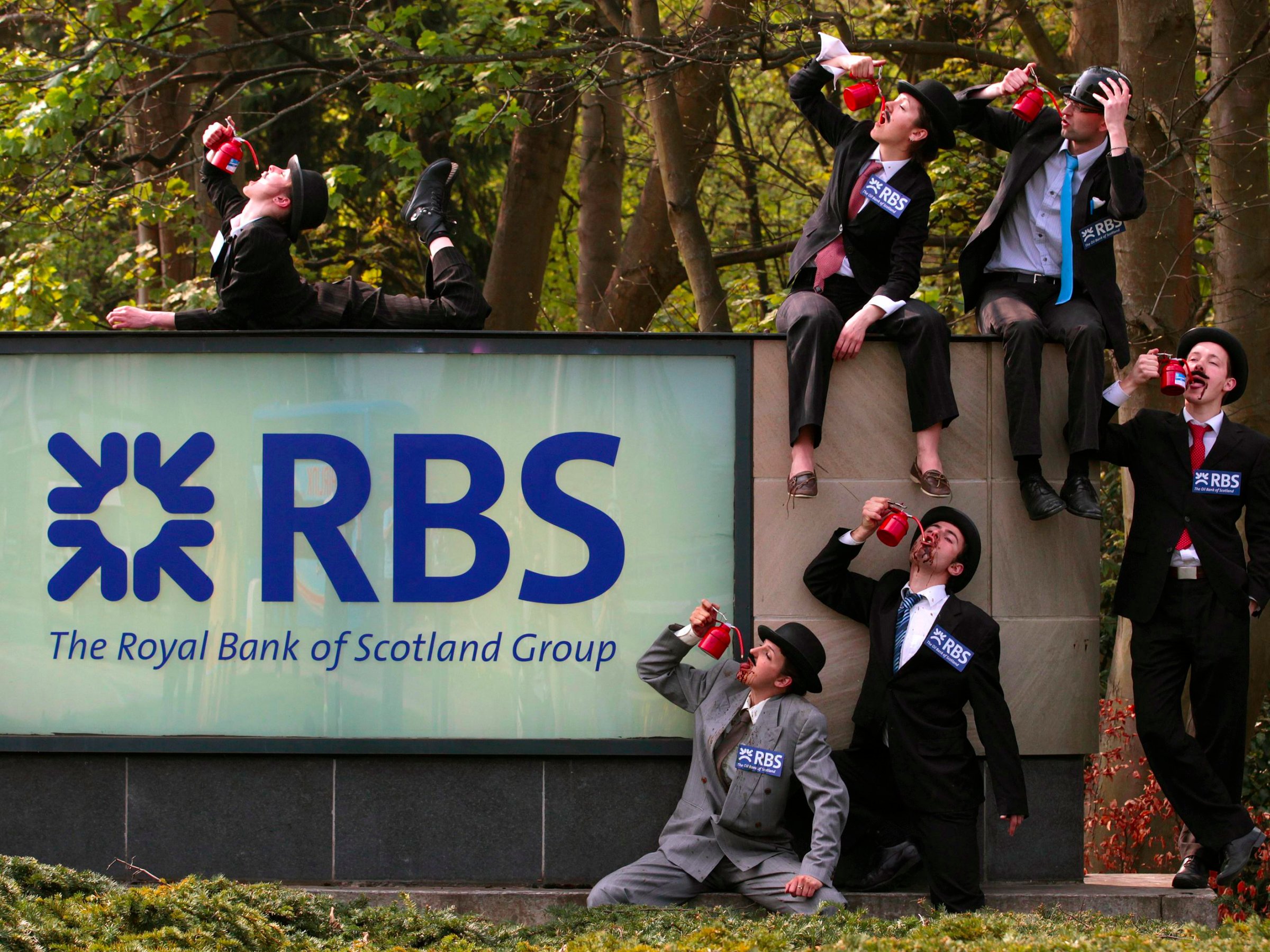 People dressed as a city bankers drink from oil cans as a form of protest outside the Royal Bank of Scotland (RBS)Reuters