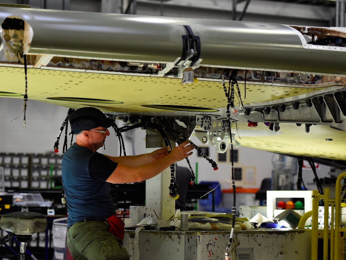 A man works on a C Series aeroplane wing in the Bombardier factory in Belfast, Northern Ireland September 26, 2017.REUTERS/Clodagh Kilcoyne