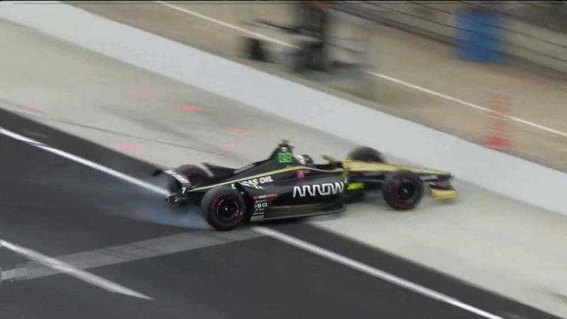 IndyCar inexperience caught out former Formula One racer Marcus Ericsson as he entered the pit lane on lap 138 in today’s Indianapolis 500. Getting slowed down from over 200 miles per hour down to the pit road speed limit isn’t exactly a cake walk. It appears Ericsson was just a bit too fast entering the lane and locked up his brakes trying to get everything whoa’d up.