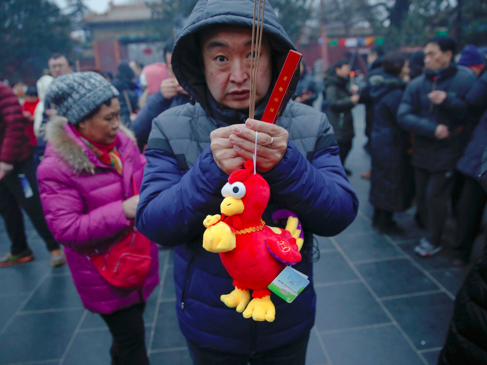 A man hold a rooster toy as people burn incense sticks and pray for good fortune at Yonghegong Lama Temple on the first day of the Lunar New Year of the Rooster in Beijing, China January 28, 2017.Reuters