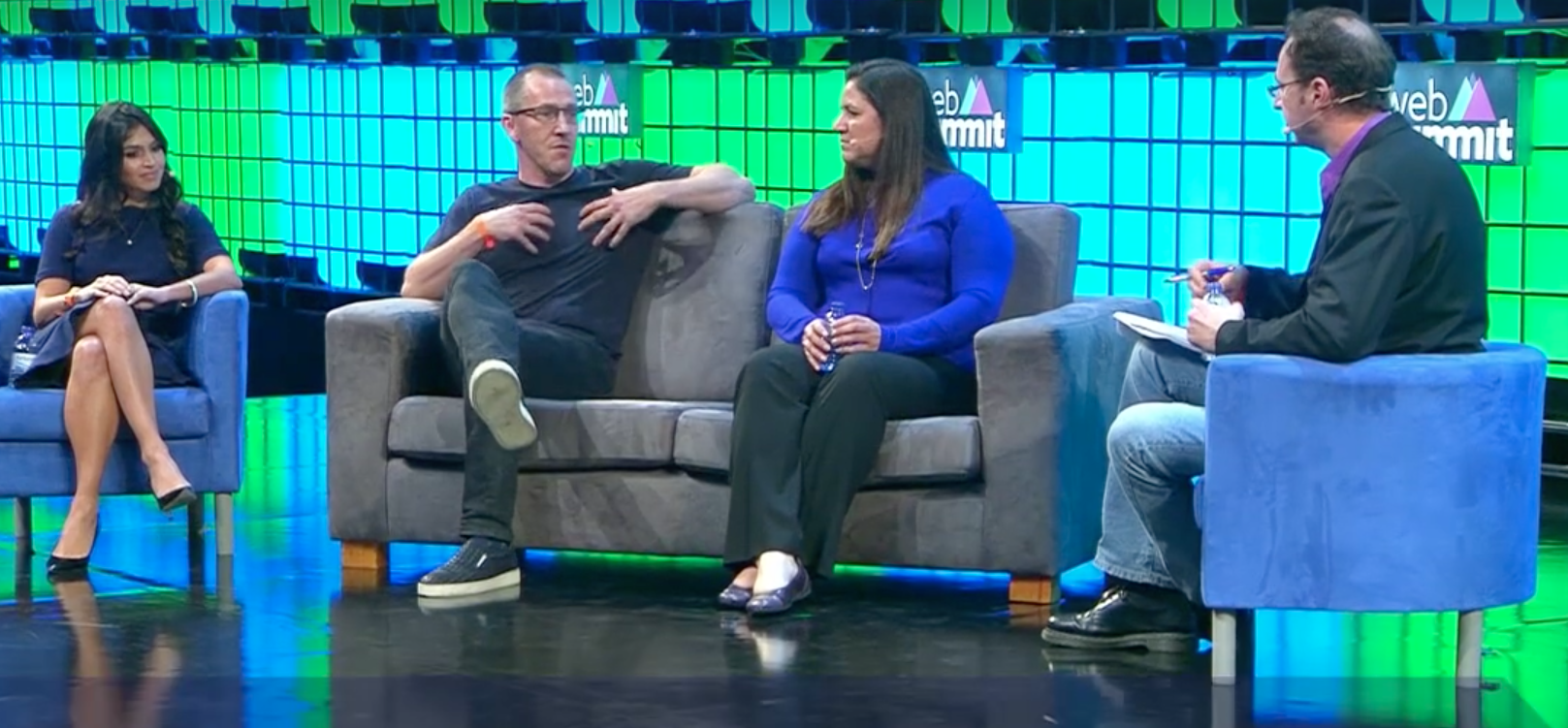 Payal Kadakia Pujji of Classpass, Fred Destin of Accel,Sarah Leary of Nextdoor, and Jim Edwards of Business Insider on stage at Web Summit in Lisbon.Web Summit