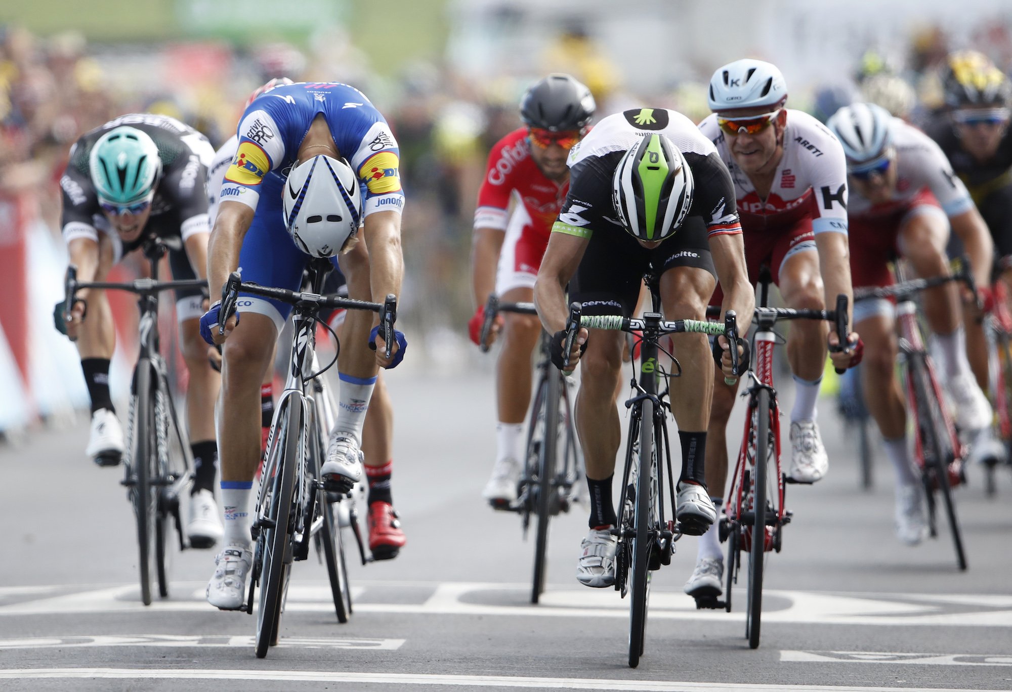 Marcel Kittel (Quick-Step Floors), left, pips Edvald Boasson Hagen (Dimension Data) on stage seven of the 2017 Tour de France.Christian Hartmann/Reuters