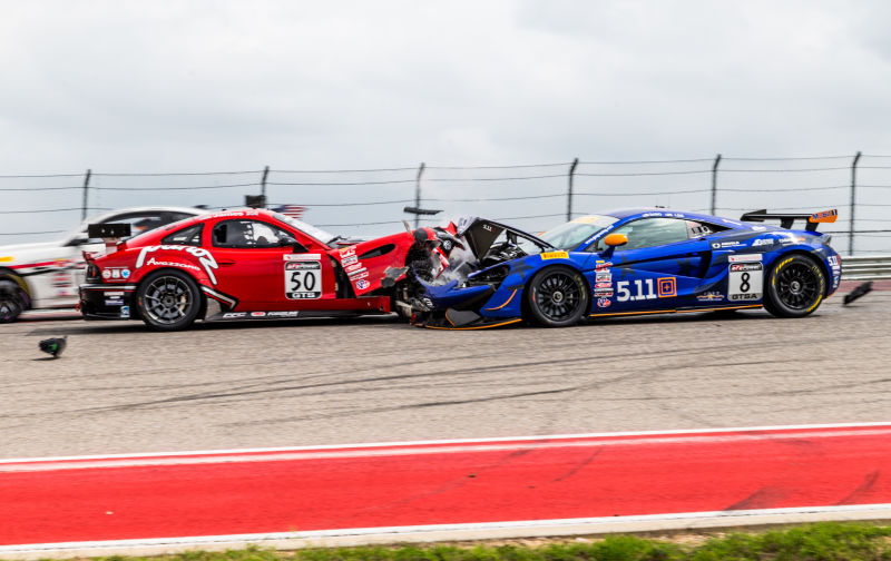 This is what happens when you’re facing backwards in the wrong place at the wrong time. The No. 50 Panoz Avezzano spun out right in the middle of Turn 1 at Circuit of the Americas during Saturday’s Pirelli World Challenge GTS-X race. When the rest of the field had to dodge the No. 50, the No. 8 McLaren 570S GT4 had nowhere to go. Fortunately, both drivers were fine.