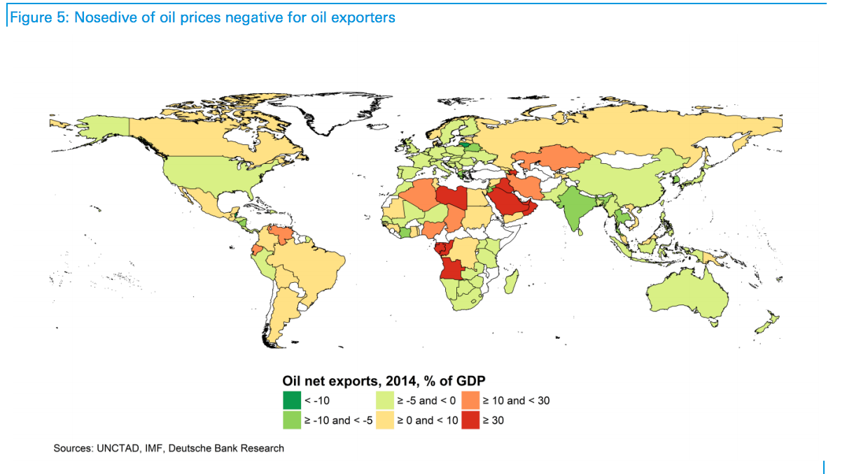 To work out how this has affected the global economy, Deutsche Bank has put together a handy map showing which countries import and export the most oil: