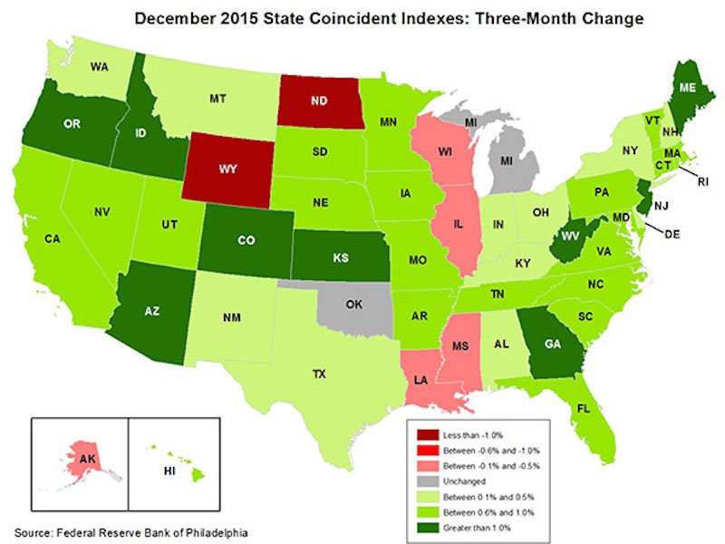 As the Philly Fed’s latest coincident indexes survey shows, seven states — North Dakota, Alaska, Wyoming, Wisconsin, Illinois, Louisiana, and Mississippi — saw economic activity contract during the three months that ended in December.